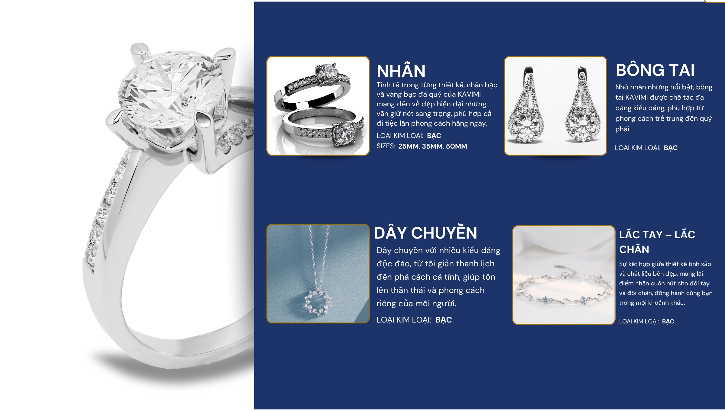 Kavimi – nơi hội tụ những sản phẩm nữ trang bạc, vàng và đá quý tinh xảo, được chế tác tỉ mỉ với mẫu mã đa dạng và giá cả cạnh tranh nhất thị trường. Với tinh thần không ngừng sáng tạo và đam mê cái đẹp, Kavimi mang đến những thiết kế sang trọng, giúp tôn vinh phong cách và vẻ đẹp riêng của mỗi khách hàng.